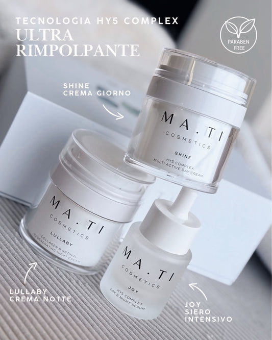Il set HY5 Complex racchiude tre formule avanzate per ridare vitalità alla pelle: una crema giorno con effetto tensore, un siero ultra-idratante con acido ialuronico a 5 pesi molecolari e una crema notte ricca e rigenerante che lavora mentre dormi.