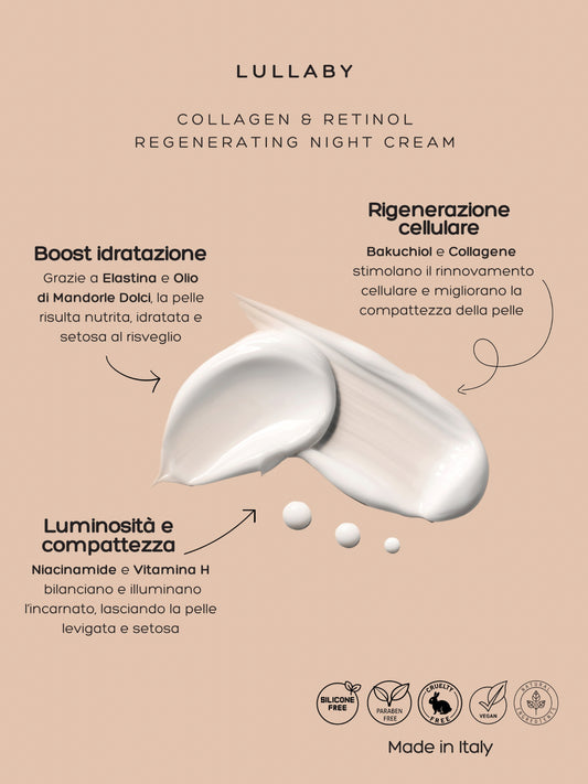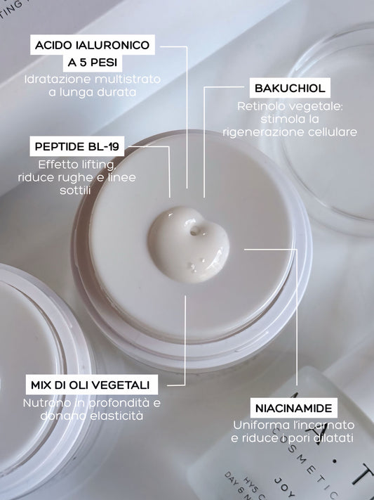 Dentro trovi attivi che fanno davvero la differenza: Bakuchiol (Retinolo vegetale), Peptidi liftanti e Oli puri antiossidanti. Insieme levigano le rughe, rassodano, illuminano e idratano in profondità.